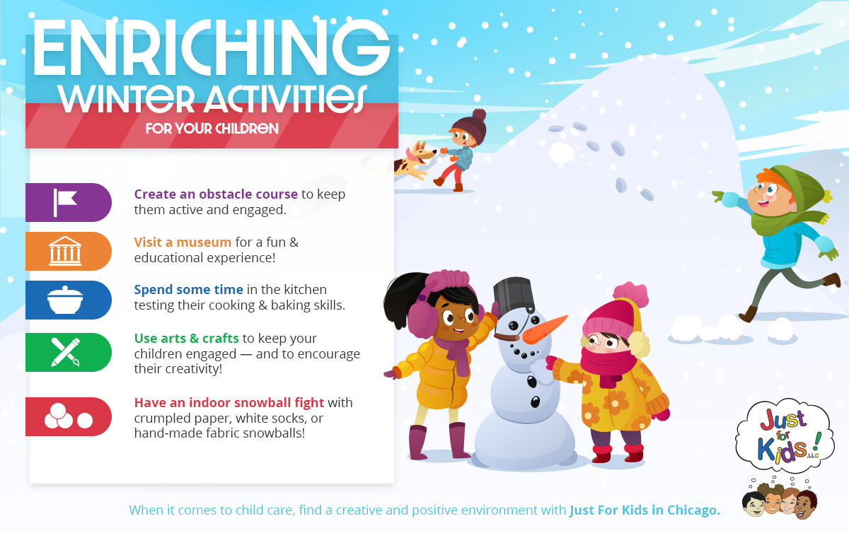 We hope that these different ideas can help you give your children something fun and educational to do this winter. At Just For Kids in Chicago, we offer different child care services, including our before and after school program, no school programs, and preschool. Contact us to learn more about our child care center, or to enroll your children today!